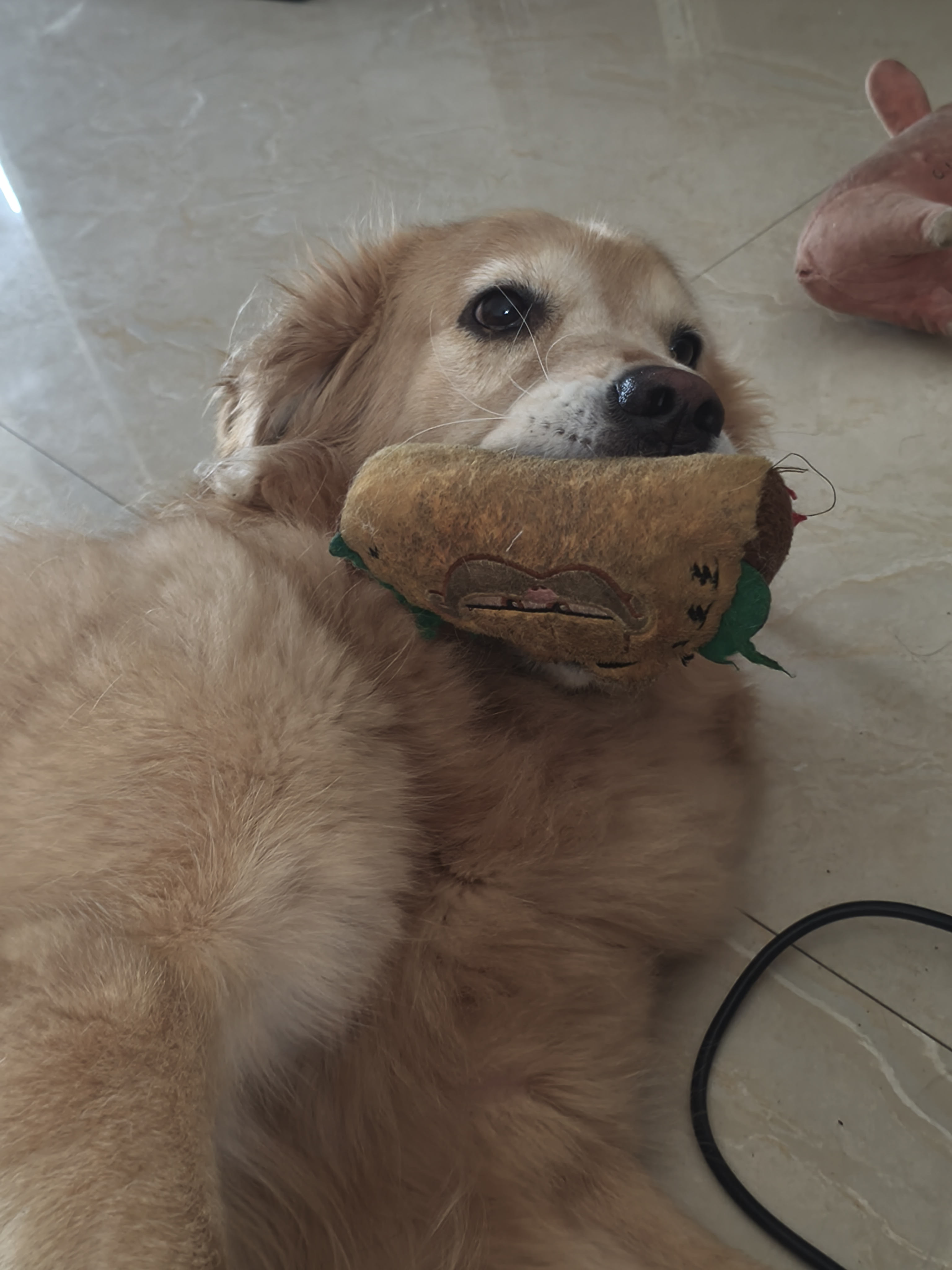 凉皮店带回来的热狗,一人一根,小狗就站在球球和鲨鱼中间,左看右看,努力端坐成一只渴望食物的乖狗狗,但最后还是一口没得吃。