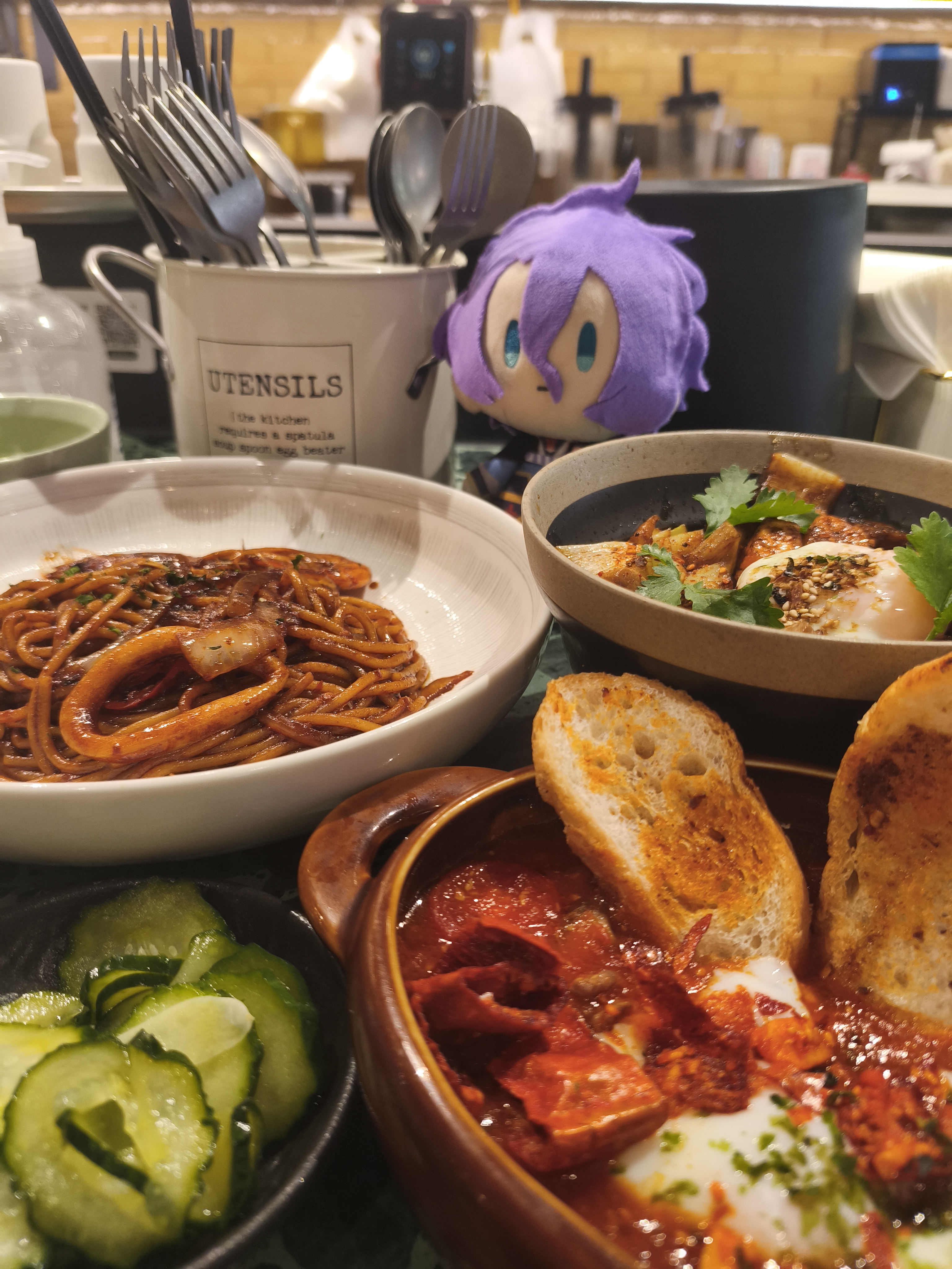 我们还点了一个白葡萄酒海鲜意面(有点辣,但是好吃好吃好吃!),一个酸汤牛肉芝士温泉蛋饭(当时有点饱了,没吃很多这个,不过汤汁拌饭还不错),一个版纳甜辣鸡脚筋(好吃多吃),吃得很幸福,。临走前又给鸡蛋打包了鸡脚筋和塔可,虽然送过去半小时有点凉了,希望鸡蛋老师也吃得幸福!