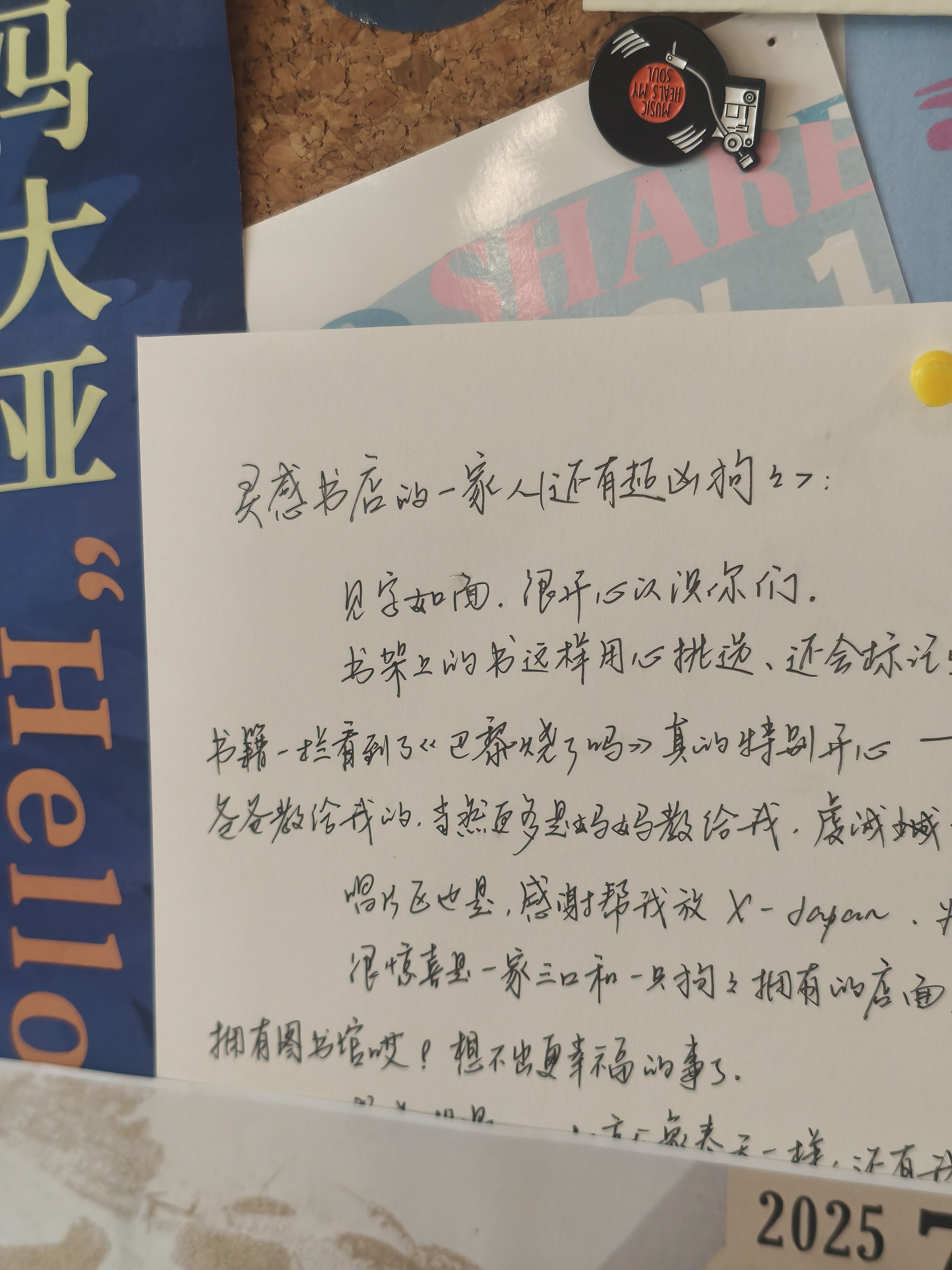 店里新增了一个木柜子,收集了很多活动海报、物料,以及一些活动嘉宾的留言(超凶的狗狗小聆是也!),角落还有小鲨给快闪店印的印章。