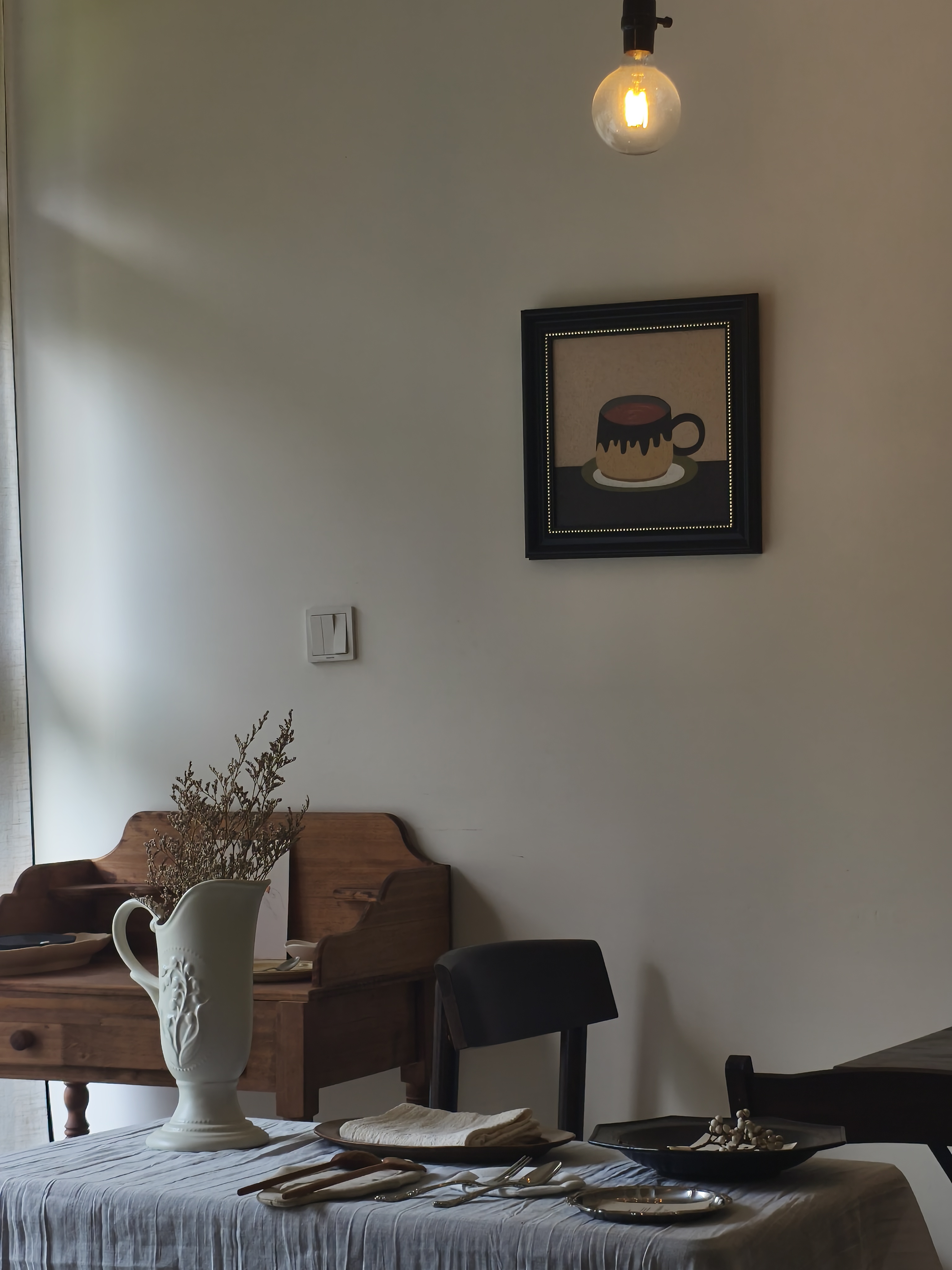 吧台的背后是圆子的画,鲨站在外面和里面做饮料的圆子社交(硬撑中),总觉得不社交就跑去自己逛自己的,有点不太礼貌。四五个来回下来,小鲨完全没有话题可以聊了,尴尬得有点想死。